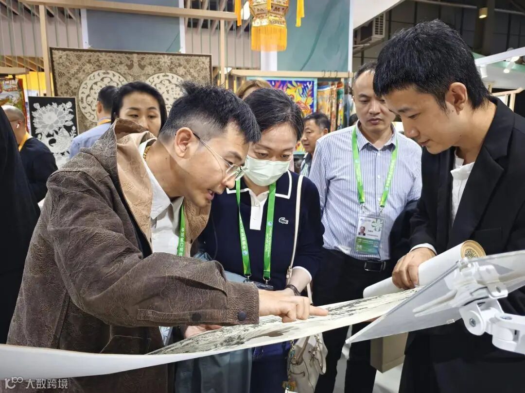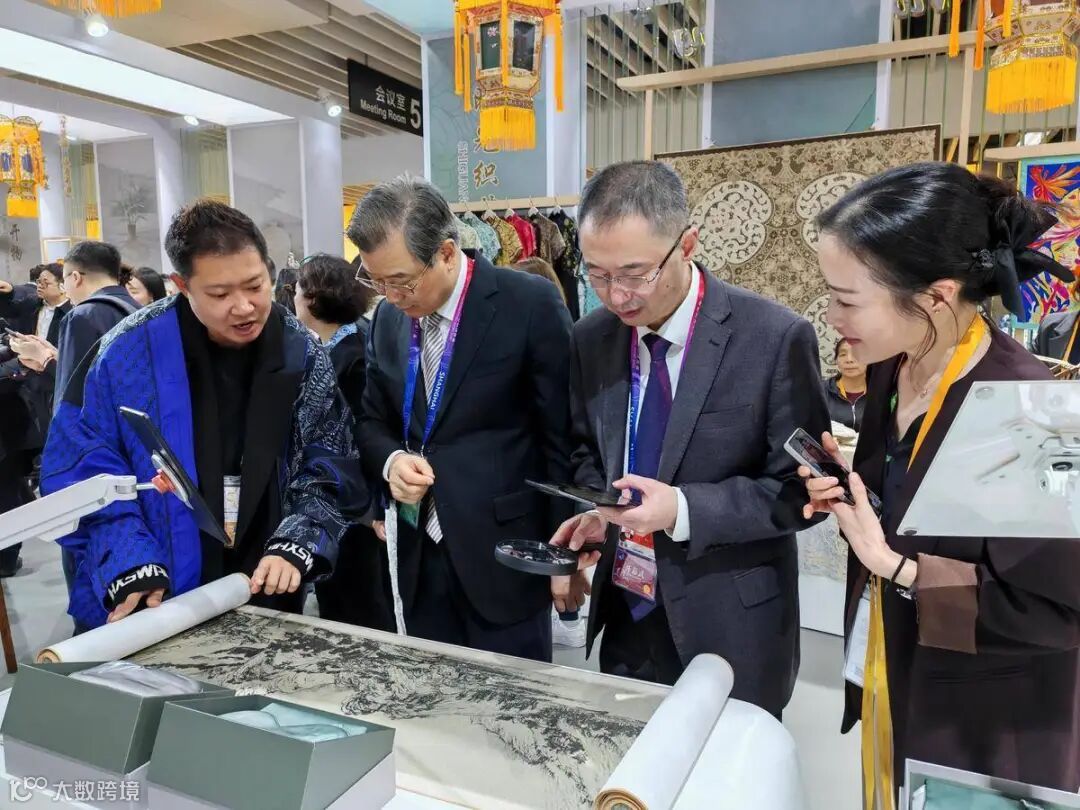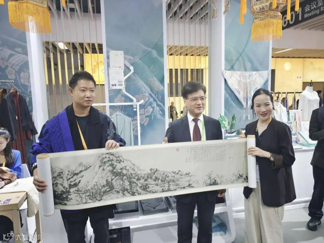 在展会首日,各级领导亲临浙江展区巡视指导,对凯喜雅将AI技术与传统丝绸工艺深度融合的创新实践表示肯定和鼓励。浙江省人民政府国有资产监督管理委员会副主任董正泉一行莅临展位,表示期待凯喜雅AI织造技术可以实现更多国宝名画以及文化传承的复刻与再现;浙江省政协副主席叶正波,浙江省商务厅党组成员、副厅长陈志成一行莅临,观看《富春山居图》AI完整版的织造细节,并就“蝴蝶缎”技术展开了详细讨论;浙江省商务厅党组书记、厅长周向军一行莅临展位,近距离观看并触摸现场的9米长卷。