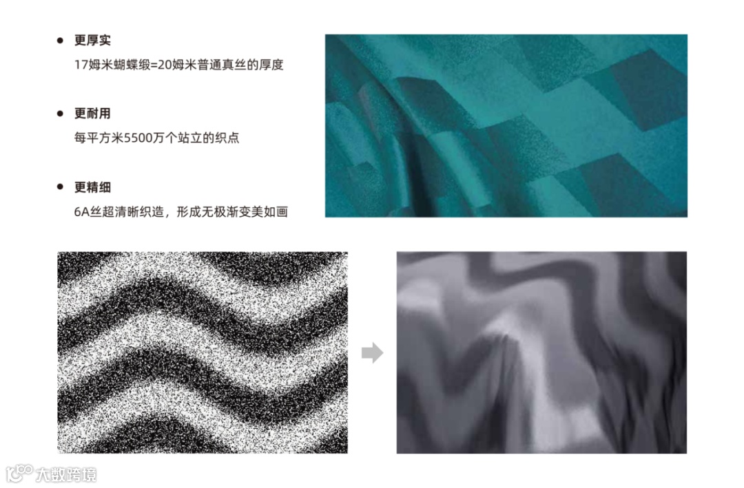 而实现这一惊艳景象的基础,便是凯喜雅的“蝴蝶缎——数字超精细织造技术”。区别于传统织造机械复制二维平面“单元组织”的形式,“蝴蝶缎”通过织机叠加AI算法,能实现每平方米5500万个立体织点,相较于传统织造精度提升了20倍以上,使得面料更厚实、更耐用、更精细。蝴蝶缎AI算法能模拟几乎所有现存的肌理组织排布方式,并且能够不断进化学习,创造出全新的面料应用。