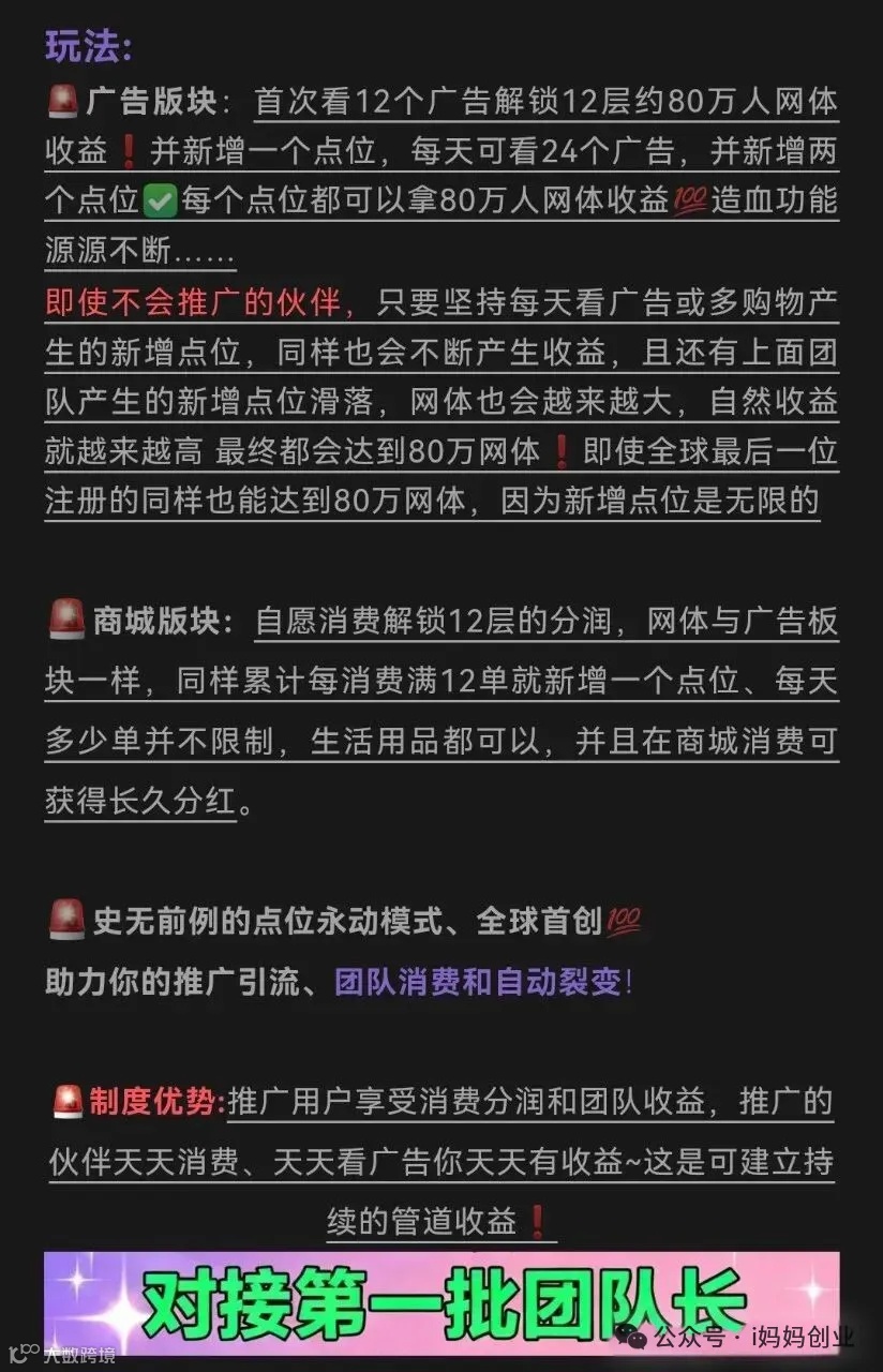 1️⃣采用三三复制、团队公排,即便不推广,占点激活送12层80万人。解决大家没有人脉资源问题❗️