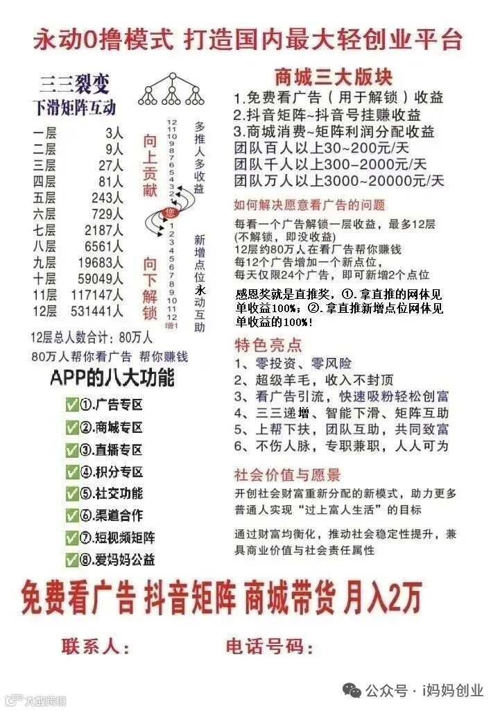 2.让人一个人不推荐,每个人网体都有80W点位给你撰💷(*自己看广告和上级或上面团队看广告每天新增的点位不断往下面滑落为你产生收益)