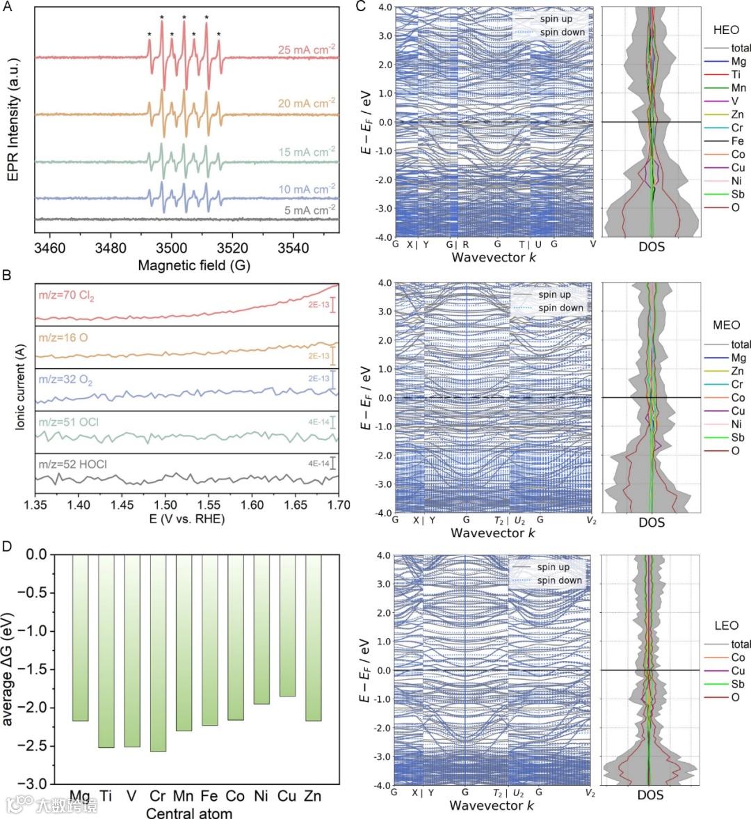 在4 M NaCl-HCl电解体系中,十元高熵催化剂在10 mA cm-2时过电位仅24 mV,具有超过95%的法拉第效率以及160小时无衰减稳定性。其质量活性高达78.1 A g-1,是商用DSA的约两倍,而成本仅0.46美元/m2,体现出显著的工业应用潜力。机理分析表明,该体系遵循Cl吸附路径而非OCl路径,Cu位点周围的高熵环境与氧空位协同降低了反应能垒。密度态计算也显示该材料在费米能级附近具有高电子态密度,有利于电子转移与中间体吸附。