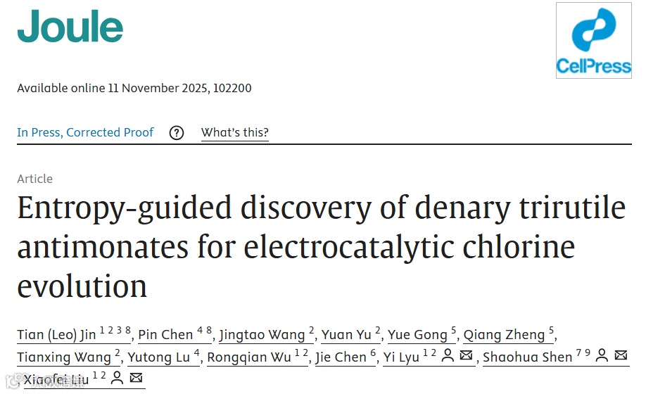 2025年11月11日,研究成果以“Entropy-guided Discovery of Denary Trirutile Antimonates for Electrocatalytic Chlorine Evolution”为题在线发表于Joule期刊。论文通讯作者是刘晓菲副研究员、沈少华教授和吕毅教授;第一/共同第一作者是金田、陈品。