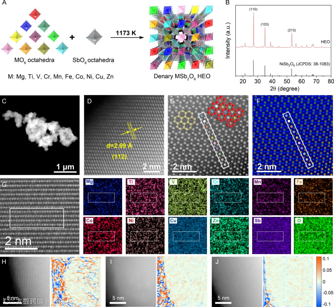 图2:十元高熵MSb2O6的结构表征与应力分析。