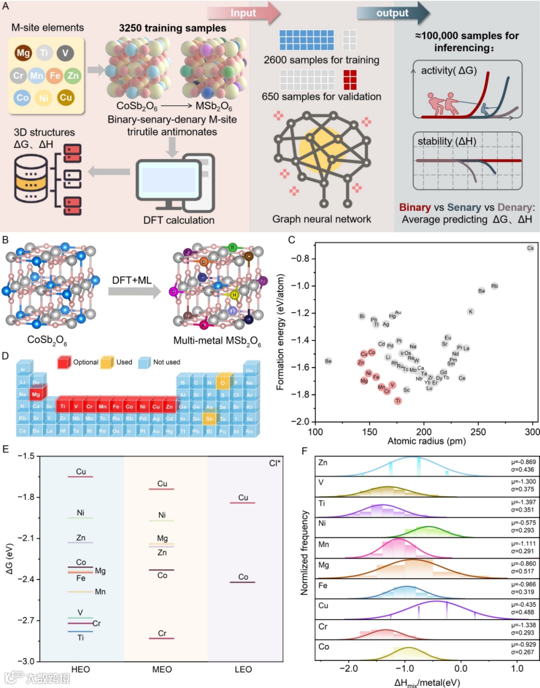氯气是现代化工体系中最重要的基础原料之一,全球每年产量超过7,000万吨,主要通过盐水电解制得。然而,氯气电解制备的核心阳极长期依赖含贵金属的“尺寸稳定阳极”(DSA),如RuO2与IrO2,尽管性能优异,但高成本与资源稀缺成为制约氯碱工业绿色转型的关键瓶颈。面对能源转型与双碳目标,开发兼具高活性与高稳定性的非贵金属析氯电极已成为行业和学术界的共同目标。针对这一挑战,研究团队提出了原子级“熵引导”(entropy-guided)材料发现策略,从单一的CoSb2O6结构出发,通过DFT系统计算不同金属取代后形成能与晶格兼容性,从元素周期表中筛选出10种金属构建可稳定共存的高熵体系(MSb2O6,M = Mg, Ti, V, Cr, Mn, Fe, Co, Ni, Cu, Zn)。进一步结合图神经网络(GNN)与蒙特卡洛采样,在105个可能构型中预测出最具热力学与电催化优势的组合,揭示高熵材料的多组元无序结构可降低体系自由能(ΔG = ΔH − TΔS)并优化活性位的电子分布。理论计算表明,随着金属组元由2、6到10种逐步增加,反应能垒不断降低,Cu位点成为最优活性中心。