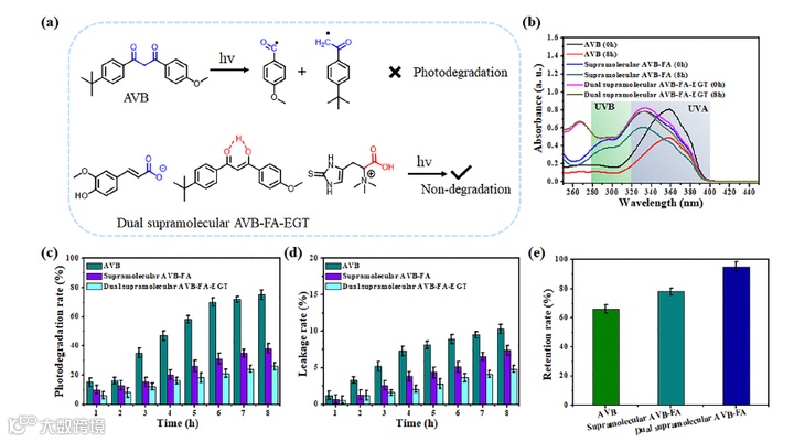 而在稳定性上,AVB–FA–EGT 的表现同样可圈可点。在UVA照射8小时后,AVB吸收峰显著下降,而AVB–FA–EGT几乎无变化,其光降解率降低34.67%,表明超分子结构有效抑制了AVB的光降解。