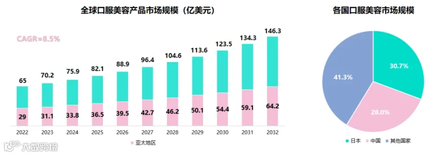 从全球范围来看,亚太地区口服美容产品市场份额位居全球首位,而日本和中国是亚太区口服美容市场的主要驱动力。