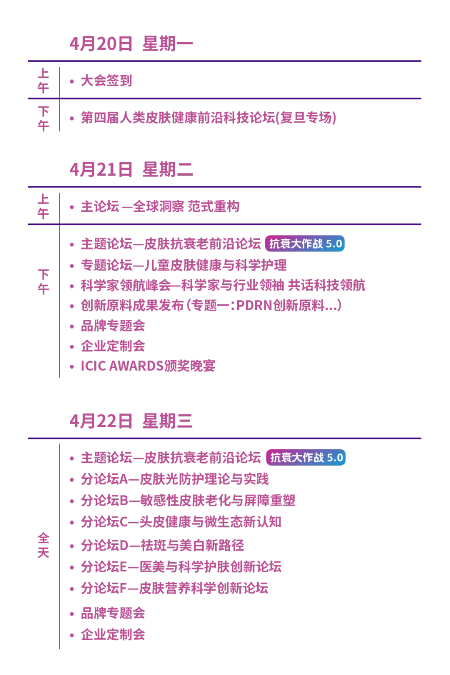 我们需要的不仅是功效卓越的产品,更需构建坚实的行业科学共识。除此之外,ICIC 2026 同步设置三大主题论坛 —— 皮肤抗衰老前沿论坛、医美与科学护肤创新论坛、皮肤营养科学创新论坛,将聚焦 PDRN 在不同应用场景下的核心痛点与未来探索方向,通过多维度、跨领域的深度研讨,系统性搭建从理论研究到产业应用的完整桥梁,助力行业在 PDRN 创新赛道上实现高质量发展。