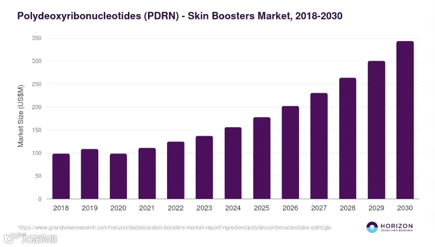 根据Horizon Databook数据,2024年全球PDRN市场规模已达15.57亿美元,预计2030年将达到34.27亿美元,年复合增长率14.1%。观察当下的化妆品市场趋势,PDRN成分可谓独占鳌头,其热度持续攀升,据统计目前已有近4000个品牌、1.6万余款产品将PDRN应用于医美与护肤领域。