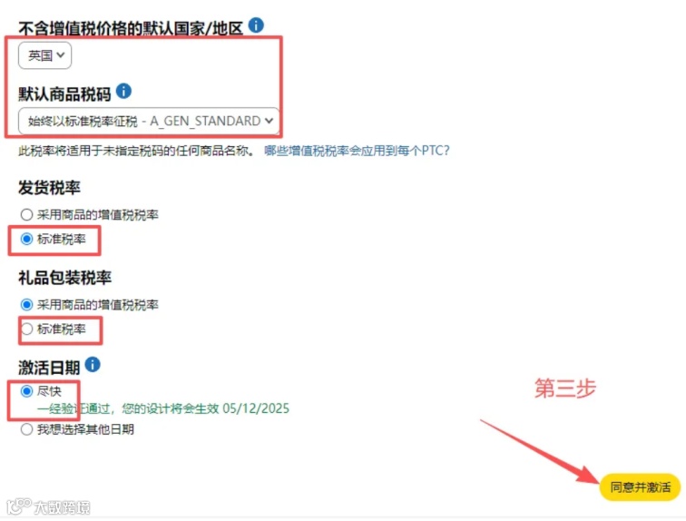 选择需要开通服务的国家或地区(例如主营英国站就选择“英国”),点击“同意并激活”;