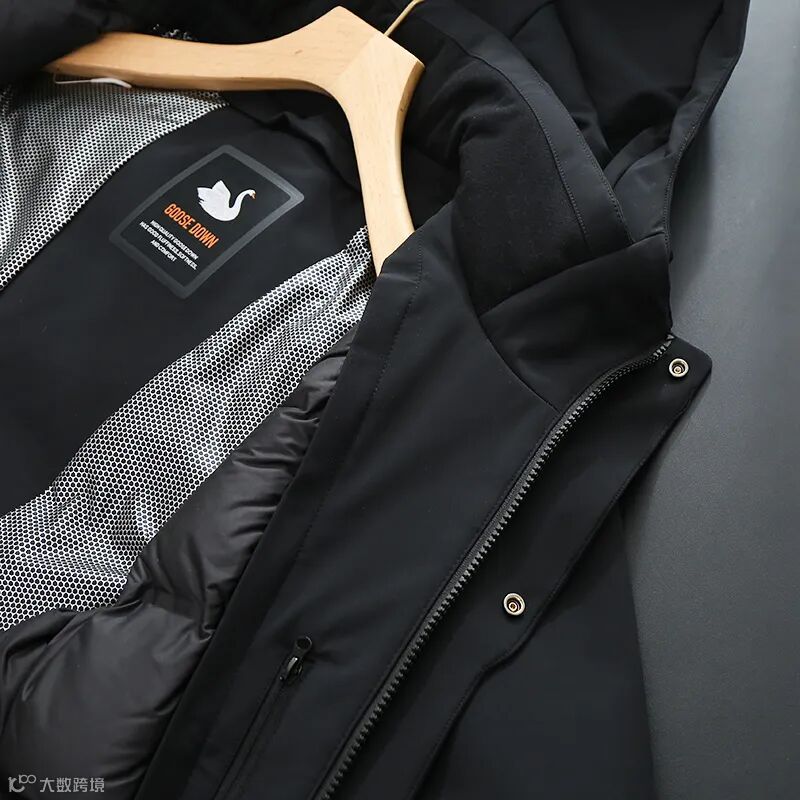 采用90%白鹅绒填充,蓬松度达700+,保暖性能优异。外层为防风高支耐磨面料,具备防泼水功能;领口内里为细腻绒面,亲肤舒适。抽绳连帽设计增强防风性,双重门襟搭配直筒中长剪裁,立体利落,彰显商务气质。