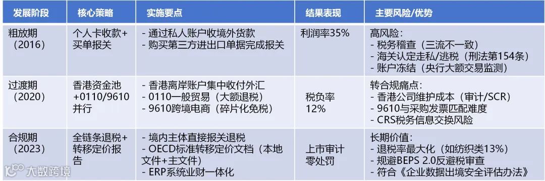 ▸ 逐步从违规操作转向1039无票免税模式,最终升级为正规0110有票退税模式。