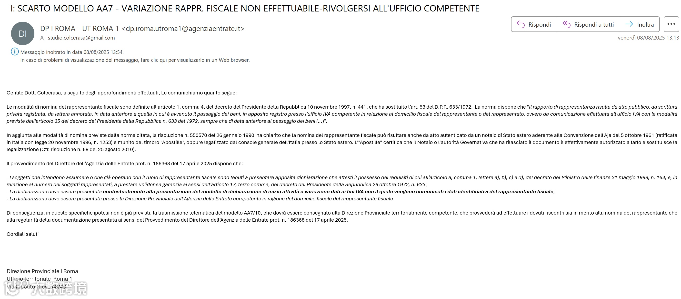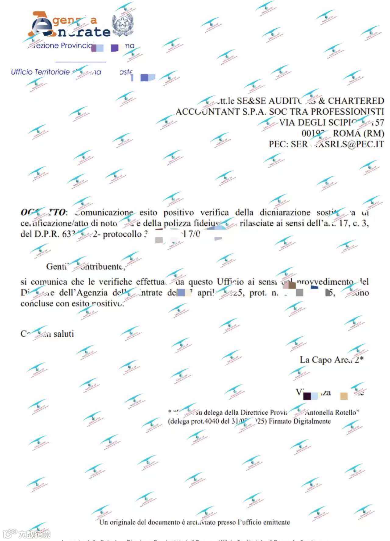 在跨越无数挑战与考验后,今天我们怀着无比激动的心情向大家宣告:经过严苛的审核与种种挑战,我们的意大利合作伙伴 Francesco 先生成功获得意大利税务局(Agenzia delle Entrate)官方资质认证,成为意大利税局官方认证的第一家税务代表机构!