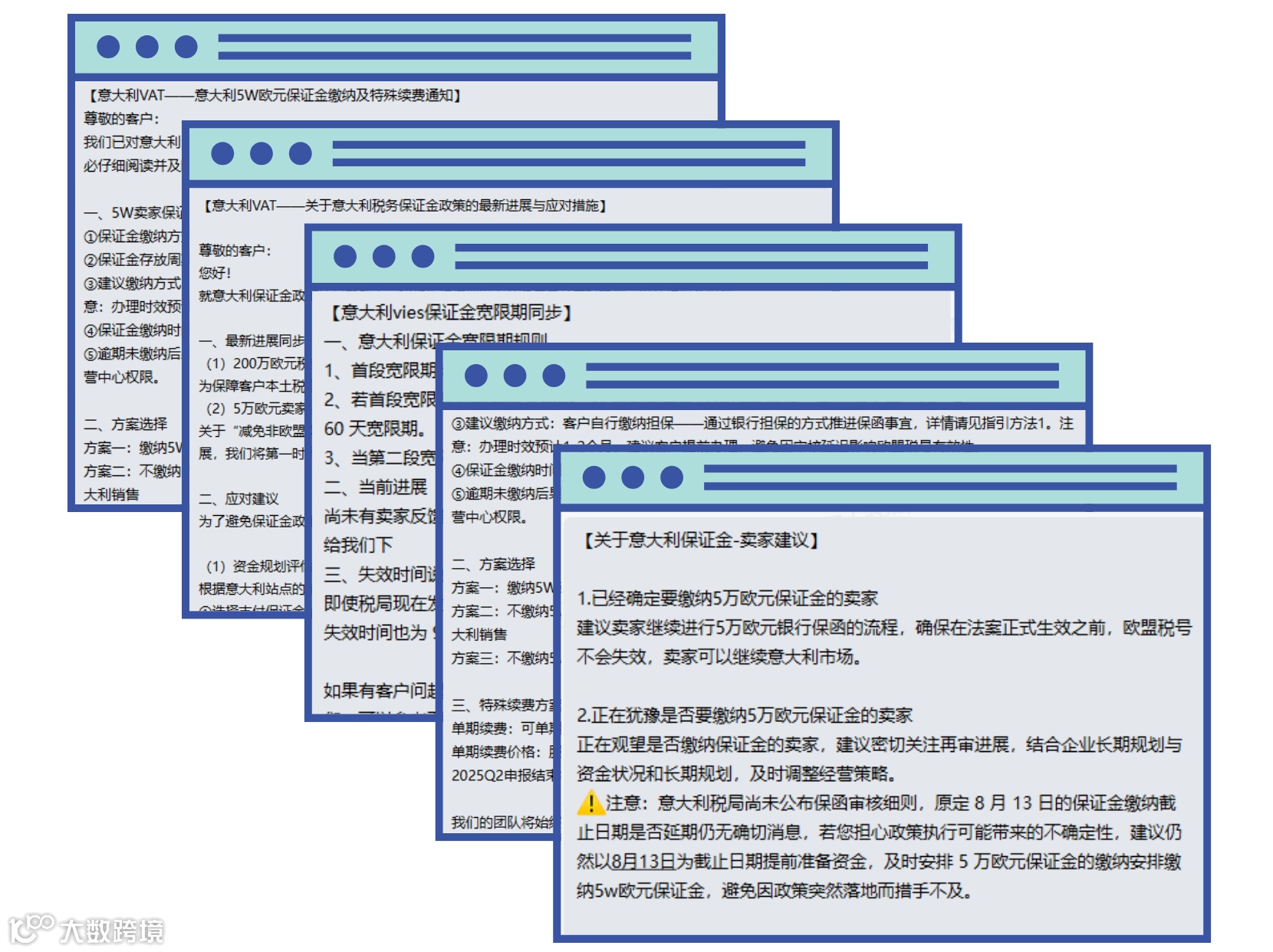 2025年初,意大利税局推出的双保证金政策给众多有志于开拓意大利市场的中国企业带来了巨大冲击。税务代表需缴纳200万欧元保证金,跨境卖家需缴纳5万欧元保证金,这样严苛的资金门槛,让不少企业陷入了困境,也给我们的资质申请之路蒙上了一层阴影。