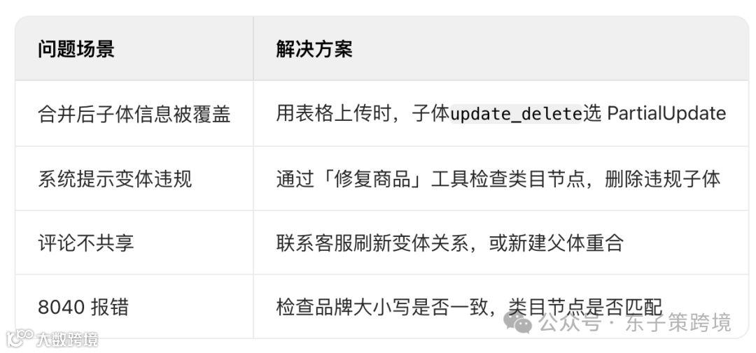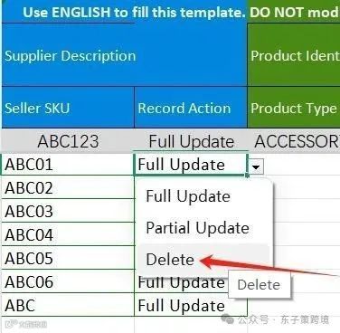 恢复子体:重新打开表格,将 “Delete” 改回 “Full Update” → 再次上传,子体恢复为独立商品。