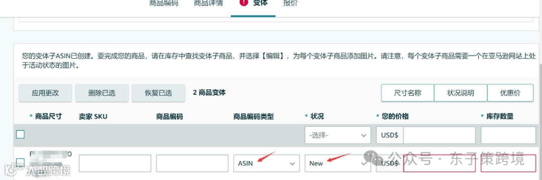 Step2:填写父体基础信息,添加子体 SKU,填写变体信息,商品编码填上对应的ASIN号,然后价格,库存数量,可以去后台看然后填上