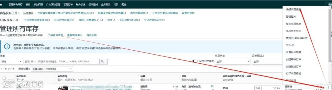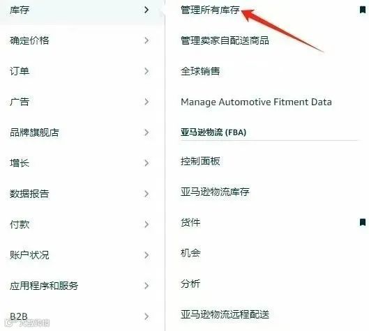 打开卖家平台,从【库存】下拉菜单点【管理所有库存】