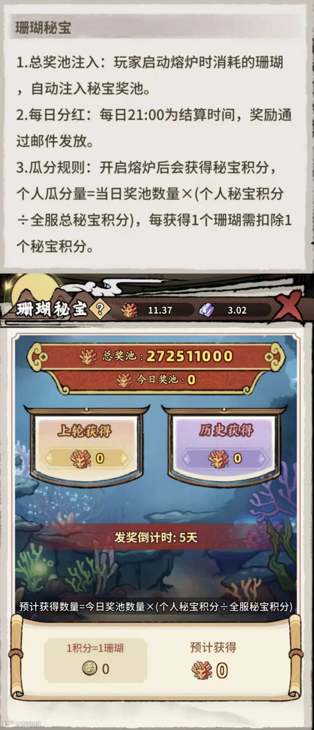 -珊瑚秘宝玩法:熔炉消耗珊瑚的90%进入奖池,第7天起每日释放1%,中型及以上熔炉开启可获积分,按个人积分占比瓜分奖池。