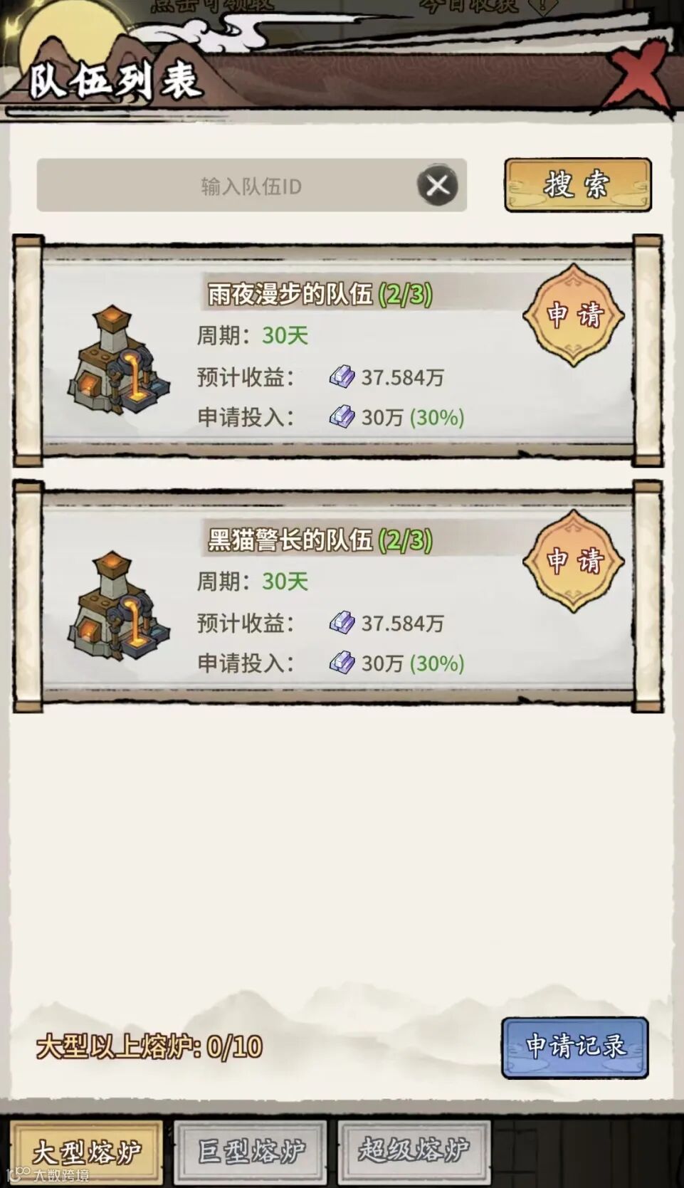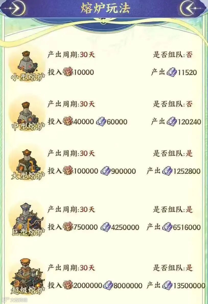 -大型及以上熔炉需组队开启,队长固定投入40%(含珊瑚),成员按投入比例瓜分收益;小型熔炉单人可开,投入10000珊瑚预计产出11520收益。