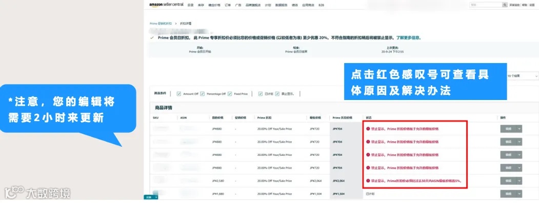 一般情况下,“状态”栏里都可以找到被禁止显示的Prime专享折扣及禁止显示的原因,大家需根据提示原因编辑促销设置。