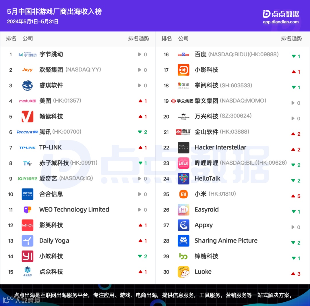 5月中国非游戏厂商出海收入Top30