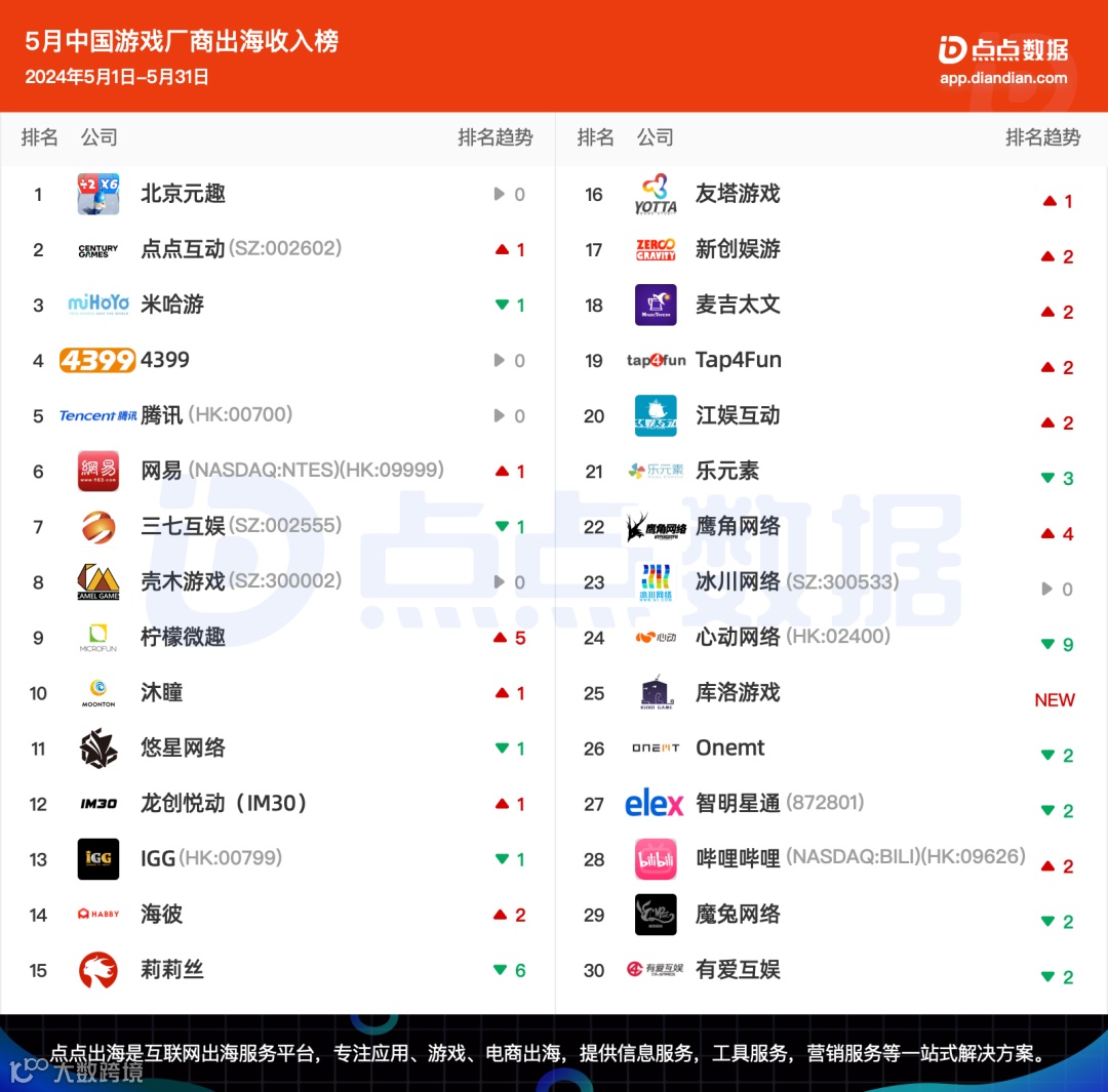 库洛游戏五月中旬在全球上线了备受关注的开放世界动作二游《Wuthering Waves》(鸣潮)并在多地取得了相当亮眼的成绩,该游戏上线当月在海外取得超过1710万美元的预估收入,也推动其厂商空降榜单第25名。哔哩哔哩(NASDAQ:BILI)五月收入端也有较为明显的增长,超过47.5%的海外收入增幅也推动其排名再次前进2名。