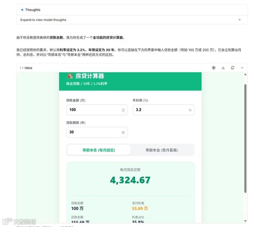 实际场景:问它“如何计算房贷”,它不是给你一堆公式,而是直接生成一个可以滑动的房贷计算器卡片;问它“对比两款手机”,它会生成一个交互式对比表格。