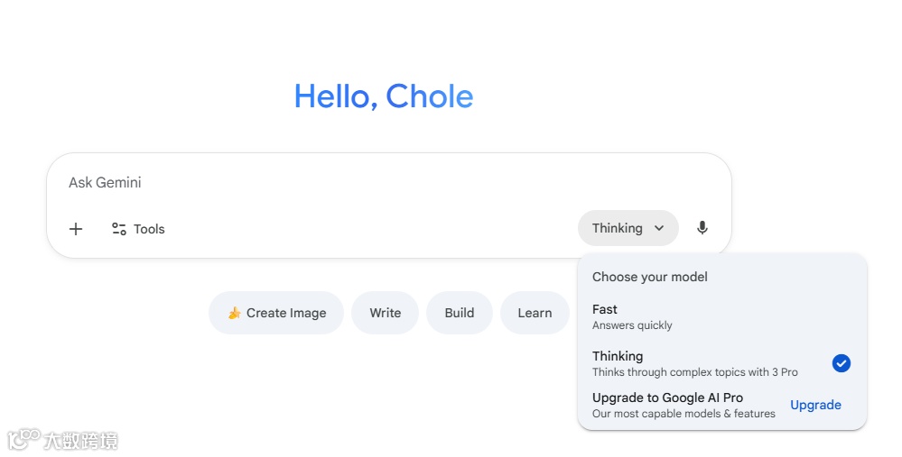 当前免费体验 Gemini 3 Pro可打开Gemini网页版,指令框右下角选择“Thinking”模式即可。