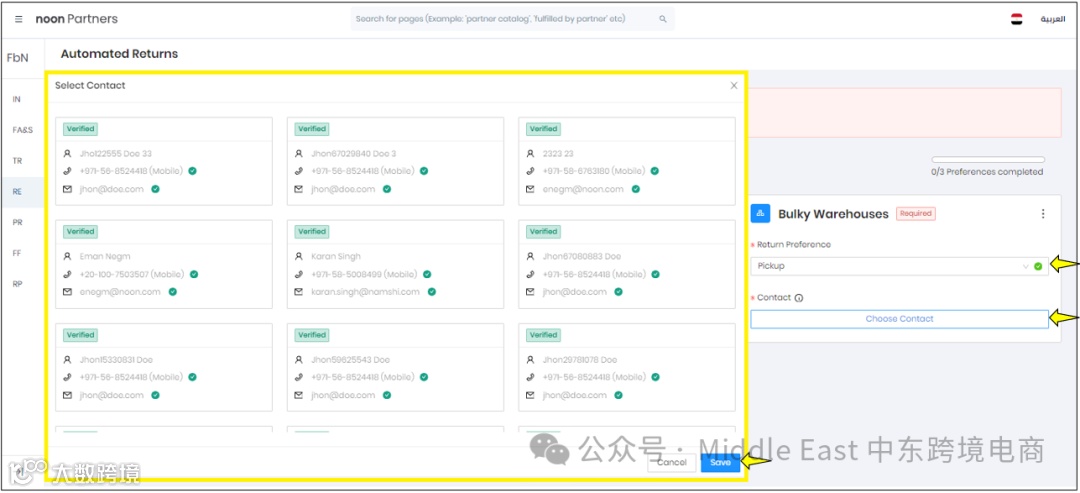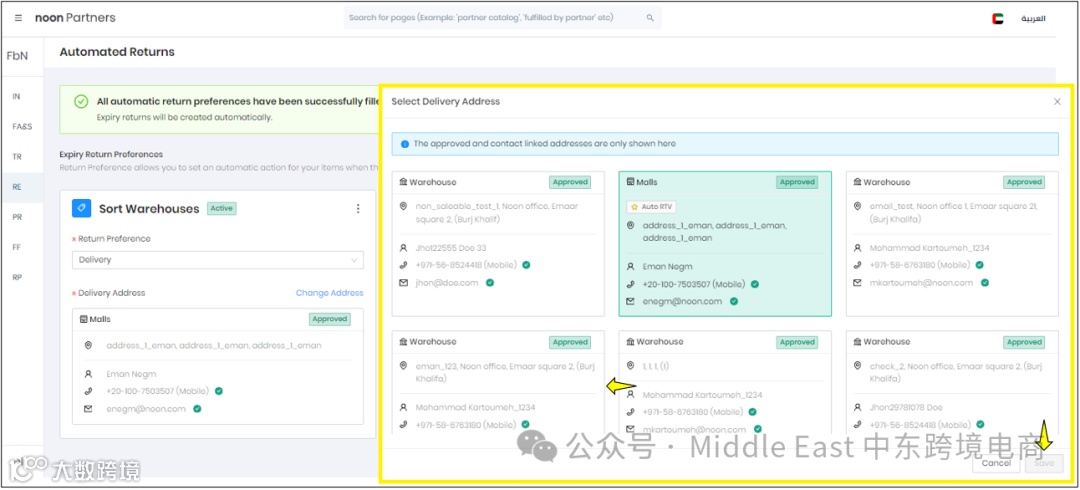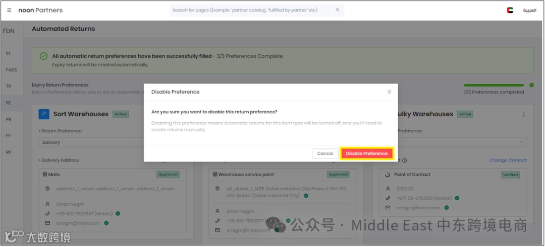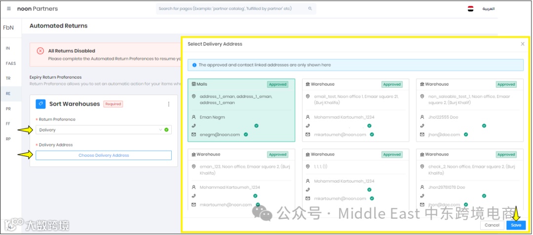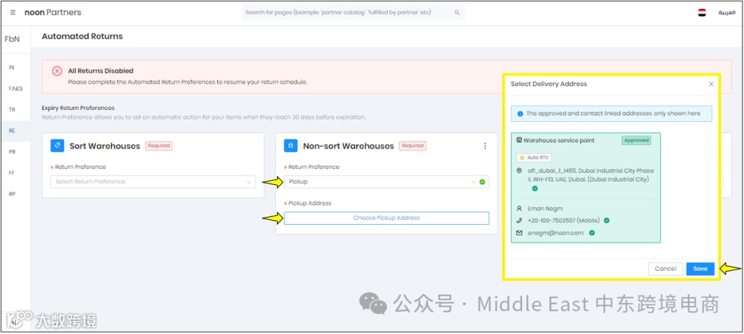 在阿联酋和埃及站点,根据仓库类型选择可用选项中的Return Preferences。