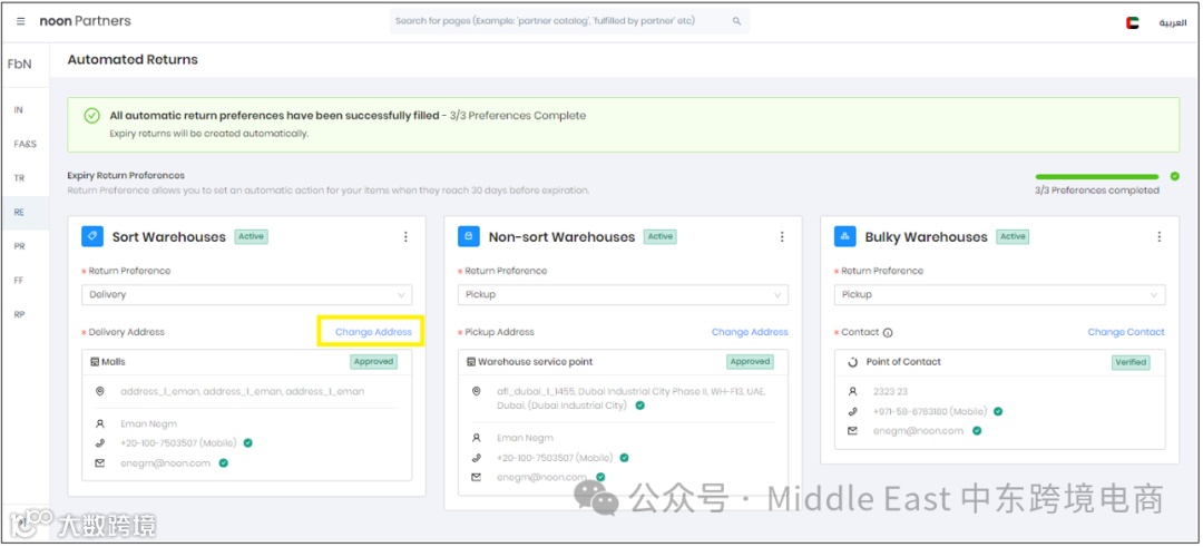 在Automated Returns页面,卖家可以在每种仓库类型下找到对应的Change Address按键。