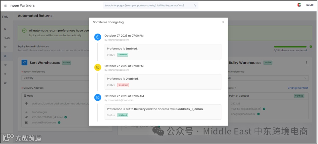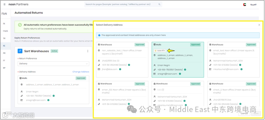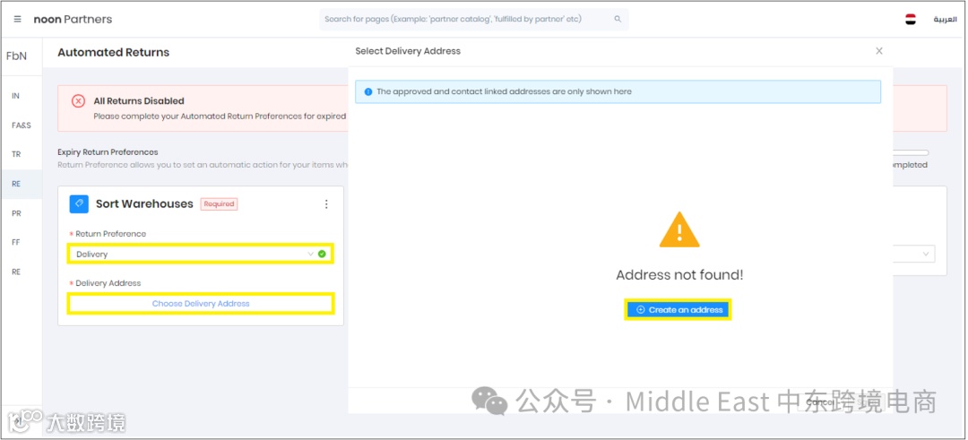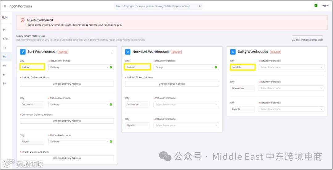 在沙特站点,设置可以根据仓库类型为每个城市选择不同的Return Preferences。