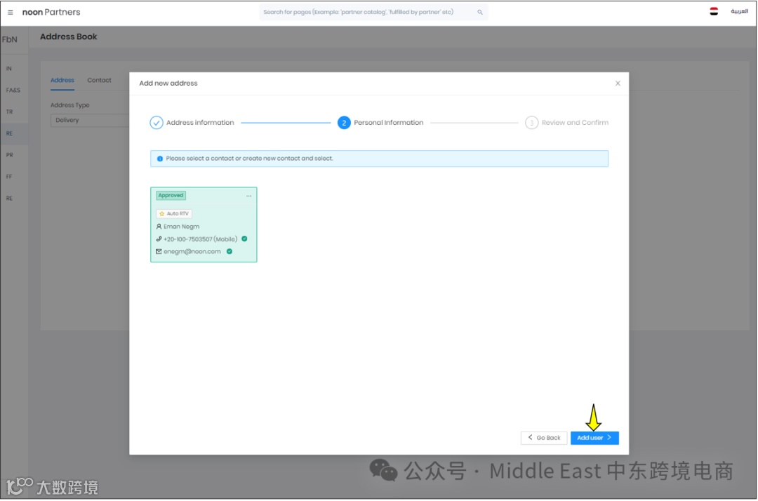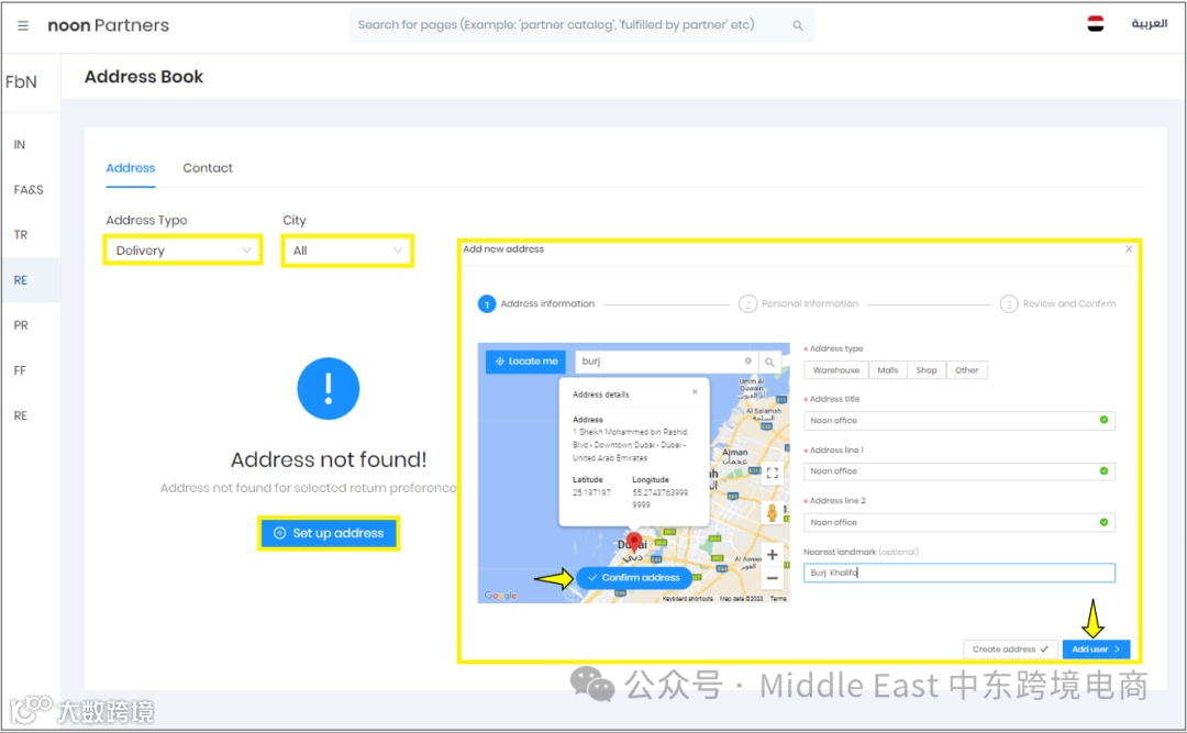 接着将看到地址类型为Delivery,城市为All。点击Set up address。在弹出窗口中选择和确认标记位置,并填写详细信息。然后点击Add User按键。