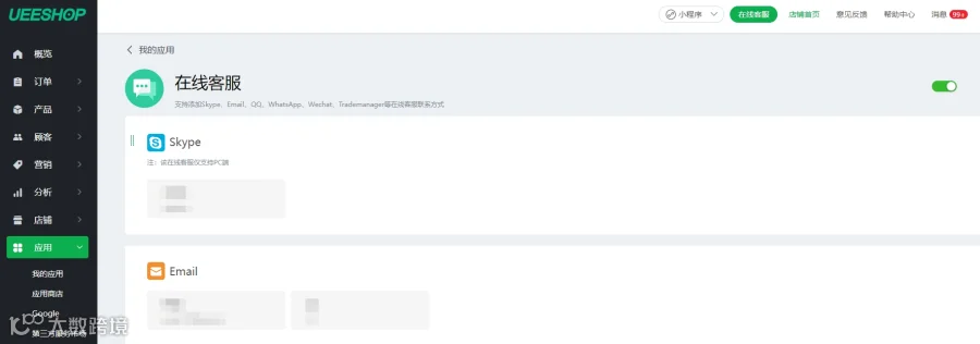 Ueeshop在线客服功能,支持添加Skype、Email、QQ、WhatsApp、Wechat、Trademanager等在线客服联系方式,卖家添加客服账号后,顾客即可在前端直接发起聊天。提供在线客服服务,能够帮助消费者及时解决问题,扫清购买障碍,从而提升转化率。