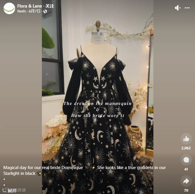 Facebook是为Flora & Lane官网带来最多社媒流量的平台,Flora & Lane在Facebook上发布的帖子,均为视频帖,相较于图片和文字,视频能够更加生动且全面地展示婚纱的整体样式,从而提高产品对消费者的吸引力。