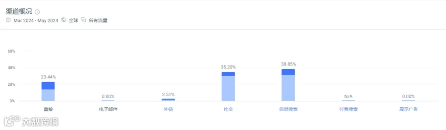 根据similarweb数据显示,Flora & Lane官网的流量主要来自于自然搜索流量(38.85%)、社交媒体(35.2%)、直接访问流量(23.44%)。