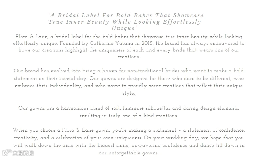 Flora & Lane的品牌定位就是非传统婚纱,其强调是为那些敢于与众不同、拥抱个性的人所设计的,这与年轻一代消费者的价值观是相符的。此外,其还提供定制化服务,自然其会受到更多年轻消费者的喜爱。