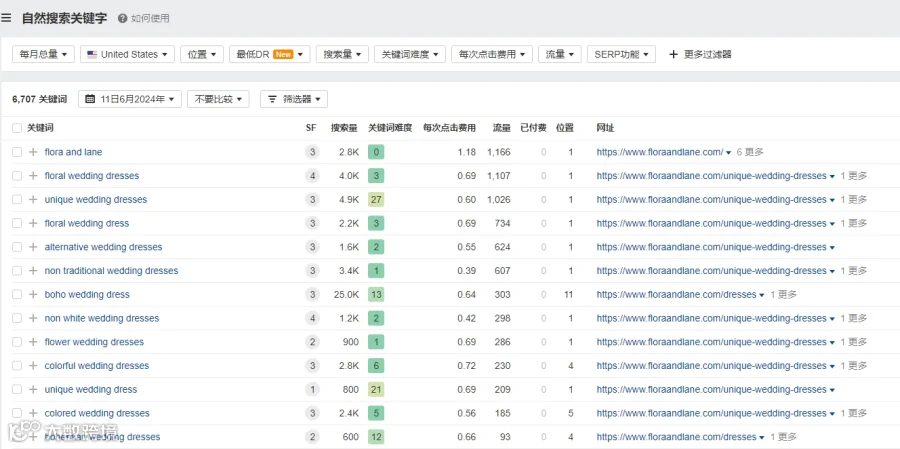 Flora & Lane所选择的自然搜索关键词,基本上是难度较低的中长尾关键词,所以我们会发现其基本上都做到了前排的位置。同时,其自然搜索关键词,大多指向的是产品列表页,而非首页。
