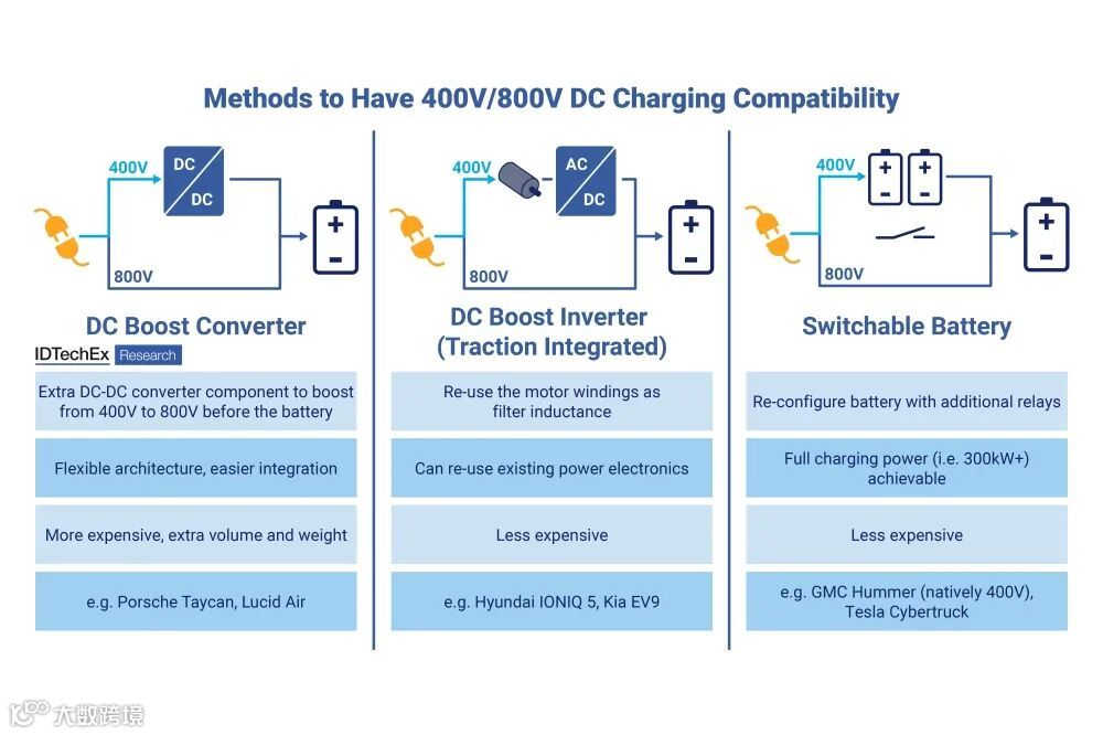 然而,向800V转型面临一个现实障碍:全球现有直流快充网络仍以400V为主。IDTechEx报告总结了主机厂应对这一挑战的三种主流技术路径: