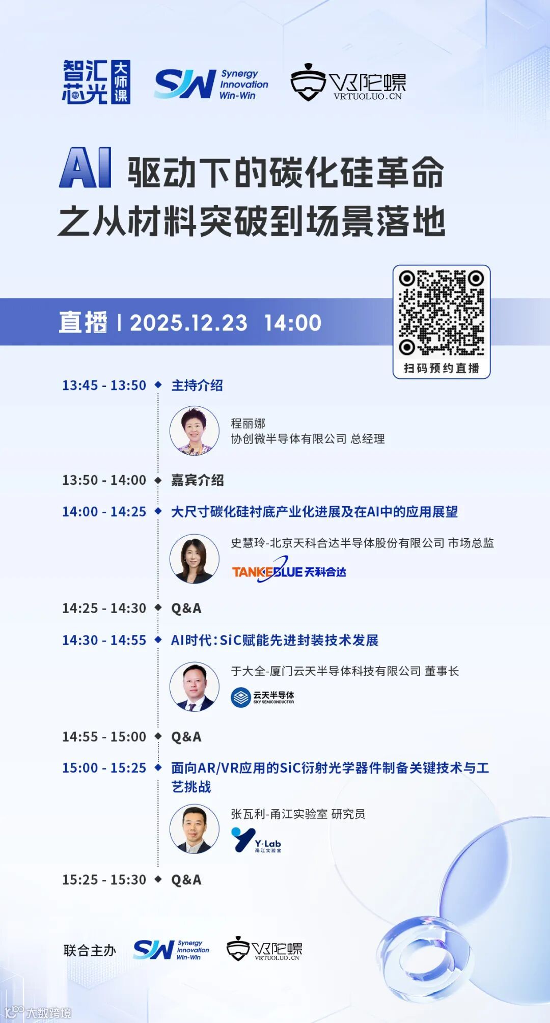协创微“智汇‘芯’光 大师课”栏目携手VR陀螺,联合主办「AI驱动下的碳化硅革命之从材料突破到场景落地」线上研讨会,12月23日14:00“协创微洞察”视频号在线直播,天科合达/厦门云天/甬江实验室专家带你直击产业核心,全景解析碳化硅的技术演进与场景实践,共同探讨碳化硅如何为AI时代散热降耗、突破瓶颈!