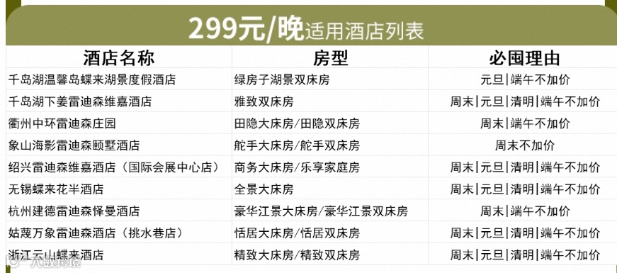 先说下299元/晚的档位,给到的是千岛湖温馨岛蝶来湖景度假酒店、千岛湖下姜雷迪森维嘉酒店、衢州中环雷迪森酒店、无锡蝶来花半酒店等。,包括绿房子湖景双床房,元旦/端午不加价。千岛湖温馨岛蝶来湖景度假酒店位于千岛湖镇温馨岛,近千岛湖县政府,中心湖区,骑行绿道,水下古城文化科技主题乐园,进贤湾水上乐园。四面环湖,周围环绕着健康的绿色环境,有着得天独厚的稀缺自然湖景和亲水沙滩。