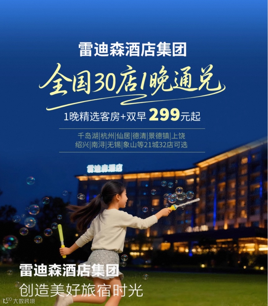 【省中旅】雷迪森酒店集团江浙沪20城30店1晚含双早通兑套餐 周末不加价 周边游首选=299元起