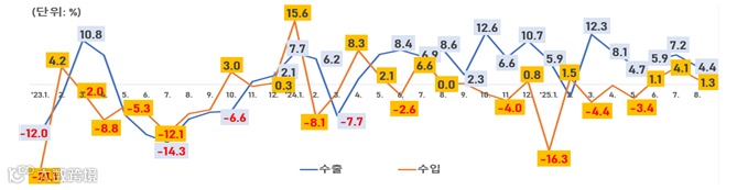 - (수출) 미 고관세 영향으로 7월 대비 둔화했으나, 타지역향 수출이 對美 수출 감소분을 상쇄하며 플러스 성장 유지