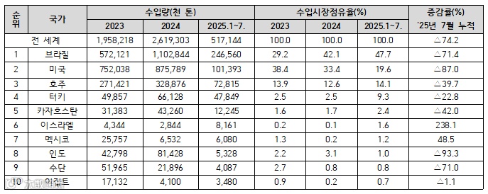 * 2025년 7월 누계 중국의 對美 목화 수입량은 전년 동기 대비 87% 감소했으며, 미국의 중국 수입시장점유율은 2023년(38.4%)의 절반 수준인 19.6%로 감소