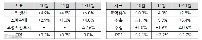 - (물가) 계절 요인으로 식품값이 플러스 전환하며 전체 소비자물가지수(CPI, 11월 +0.7%) 상승폭이 확대됐고, 생산자물가지수(PPI, 11월 △2.2%)는 작년 11월의역기저효과로 개선세가 둔화됨