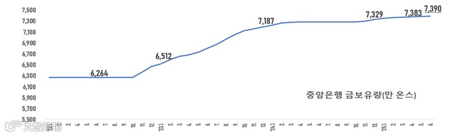 〇 2025.6월 말 기준 중국 중앙은행인 인민은행의 금 보유량은 5월 말 대비 7만 온스 증가한 7,390만 온스로, 8개월째 증가세를 타고 있음