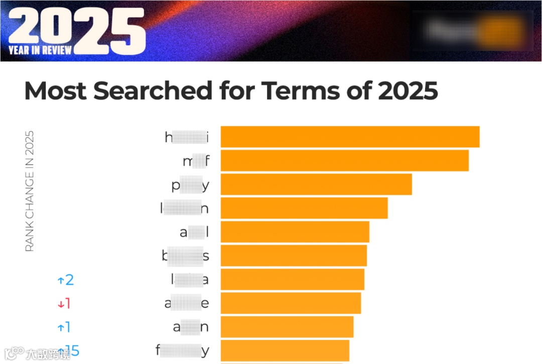 全球热门搜索词方面,hxxxxi连续第五年位居榜首,MxxF紧随其后。Lxxxxxn成为浏览量最高的分类,fxxxxy首次进入全球热搜前十。