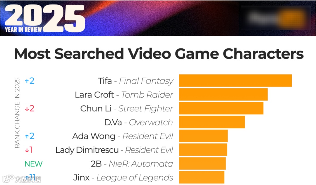 蒂法(Tifa,出自最终幻想7)取代春丽(Chun-Li,出自街头霸王),登顶最受欢迎游戏角色榜首。