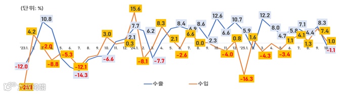 ■ 中 10월 수출 전년 동월비 1.1% 감소...8개월 만에 역성장 (11.7 海關總署)