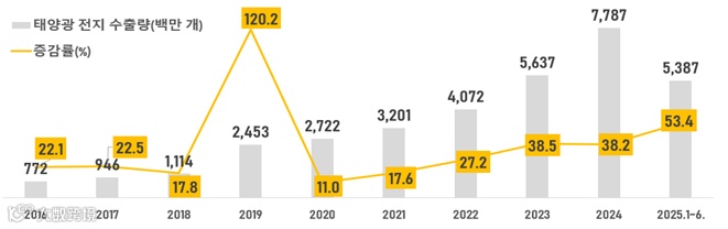 - 중국 태양광 산업의 발전 및 주요 기업의 공격적인 생산능력 확장으로 중국의 태양광 제품 수출은 가파른 상승곡선을 타고 있음. 태양광 전지의 경우, 2018년 수출량이 10억 개를 넘어선 데 이어 2019년 25억 개, 2023년 56억 개, 2024년 78억 개를 기록함. 올 상반기에는 전년 동기 대비 53.4% 증가한 54억 개로, 연내 수출량이 100억 개 돌파할 수도 있는 상황임
