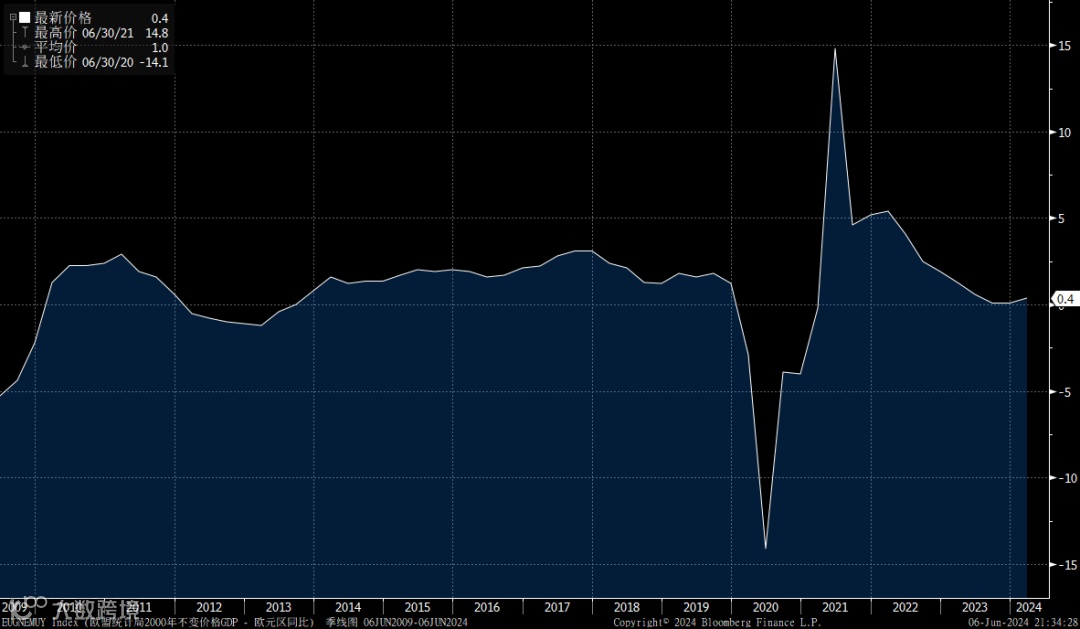 首先是欧元区经济增长疲软,信贷压力大,欧央行有降息需求。欧元区GDP增长动能不足,2023年以来,欧元区GDP增速持续下行,2022年Q4欧元区GDP季调同比1.9%,一路下降至2023年Q4的0.1%,2024年Q1同比虽然回升至0.4%,但主要分项仍然低迷。