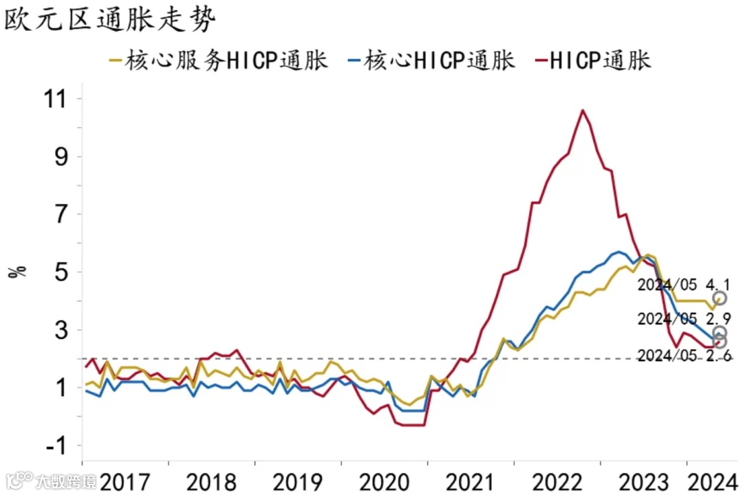 其次是通胀压力缓解给降息提供条件。欧央行的政策目标是维持欧元区物价稳定。从数据上来看,俄乌冲突导致欧洲能源和粮食价格持续上涨,随后各行业成本以及通货膨胀率一路攀升,欧元区的整体HICP同比自2022年10月达到10.6%的高点。随着欧央行加息以及能源价格逐渐回落,欧元区通胀也有所回落,2024年5月份通胀率为2.6%,而核心通胀从2023年6月开始下降至2024年5月的2.9%,因此欧元区通胀下行为降息提供了条件。